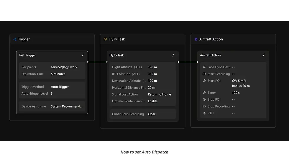DJI FlightHub 2 เพิ่มระบบ Workflow อัตโนมัติแบบ Trigger-based ผู้ใช้สามารถตั้งค่าและเชื่อมต่อตรรกะการปฏิบัติงานผ่านหน้าจอแบบ Visual Interface โดยไม่ต้องเขียนโค้ดที่ซับซ้อน