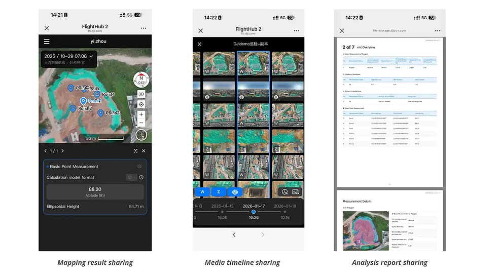 ผู้ใช้สามารถรายงานข้อมูลการบินของโดรนแบบ Real-time ไปยังหน่วยงานการบินพลเรือนหรือผู้ให้บริการจัดการน่านฟ้าท้องถิ่นผ่าน DJI FlightHub 2 เพื่อสนับสนุนการปฏิบัติตามข้อกำหนดและเพิ่มประสิทธิภาพการจัดการน่านฟ้า